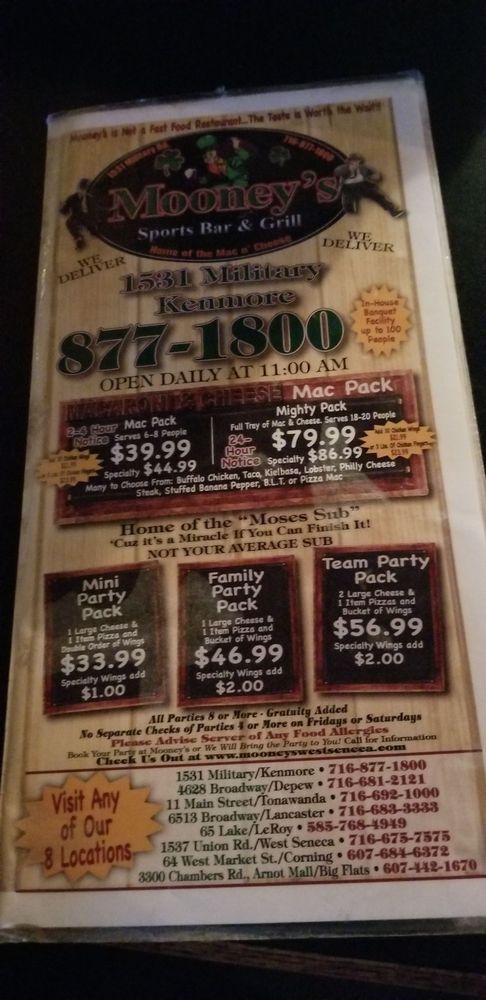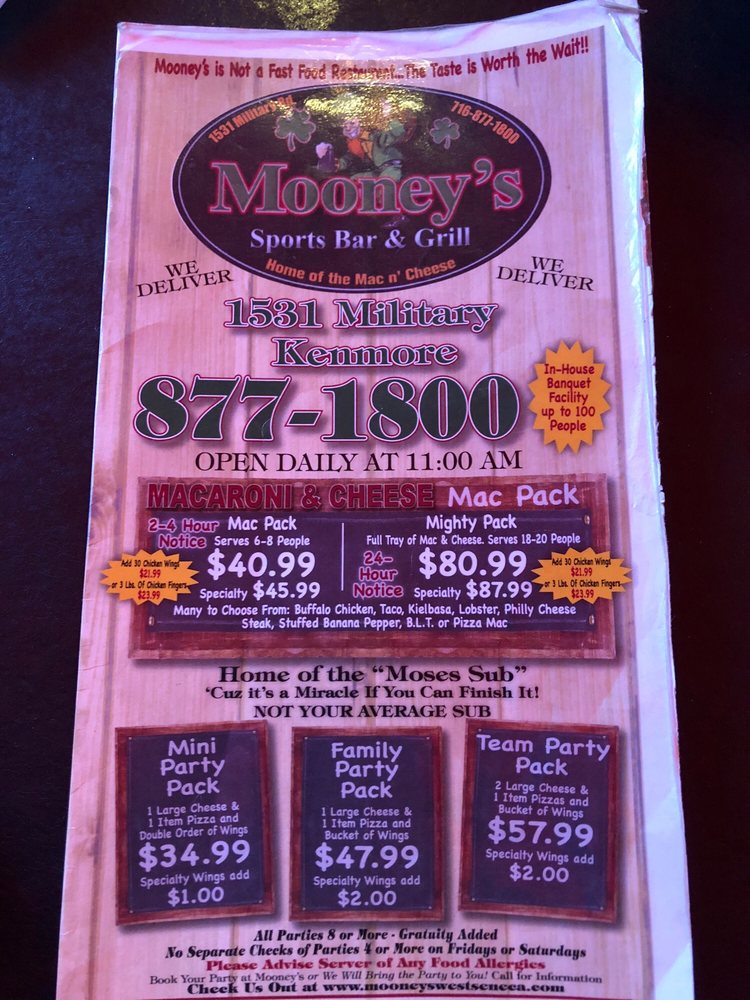 Introducing the menu at Mooney's Sports Bar & Grill, located in Kenmore, NY, is a culinary experience not to be missed. With a focus on burgers and American classics, this casual spot offers a wide range of options for everyone. From the highly recommended mac and cheese with a secret cheese sauce balance to the famous nachos and lobster mac and cheese, the menu is packed with delicious choices. Customers rave about the huge portions, great selection of toppings, and consistent quality. The atmosphere is described as chill and the staff is well-trained and attentive. Don't miss out on the banana pepper soup and the chicken bacon ranch mac & cheese. Whether you're looking for a place to grab food and drinks any time of the week or for a good night out with friends, Mooney's Sports Bar & Grill is the place to be.